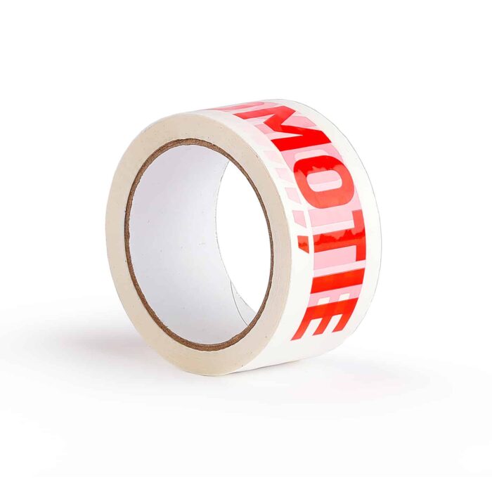 Banda este personalizata cu scris pe culoarea rosie. Se foloseste la ambalarea produselor care se afla la promotii dar se poate folosii si la impachetarea produslor fara oferta.